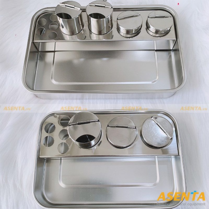 Bộ khay hũ inox đựng dụng cụ dùng cho spa, thẩm mỹ viện được thiết kế hình chữ nhật với nhiều hũ có thể đựng được nhiều dụng cụ khác nhau. Bộ khay hũ inox giúp tăng sự chuyên nghiệp khi các dụng cụ được phân chia và sắp xếp gọn gàng, ngăn nắp.