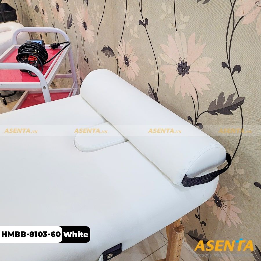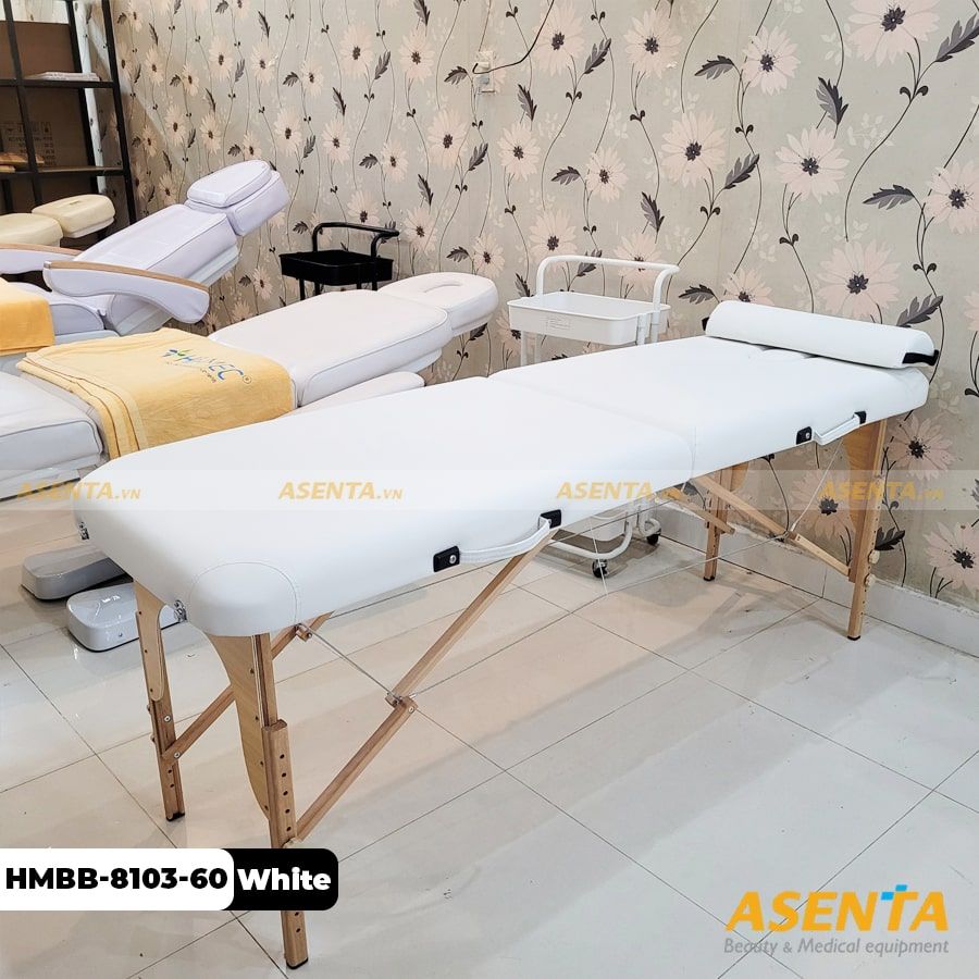 Giường Spa chân gỗ dạng vali gấp gọn HMBB-8101-60 màu Trắng là giường vali xếp gọn có chân bằng gỗ thông được khắc rõ thương hiệu Hi-mec, nệm cao cấp bọc da công nghiệp, chuyên dùng cho các trung tâm thẩm mỹ, cơ sở spa và các phòng massage dịch vụ.