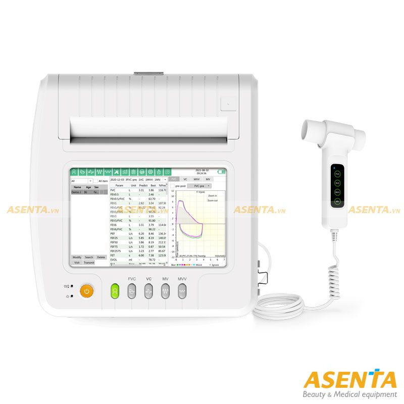 - Với công nghệ phát hiện chênh lệch áp suất cùng với phần mềm nên đã có thể đo hơn 100 thông số liên quan đến chức năng FVC, VC, MVV và MV.